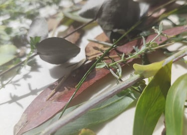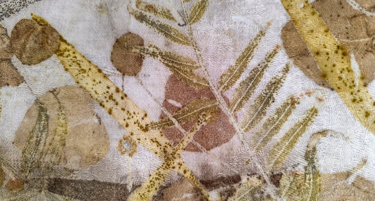 La meticulosa preparación de la tela, la cuidadosa recolección de las plantas y los tratamientos de vaporización y acabado, que duran horas, contribuyen al lento y deliberado proceso de la ecoprint. Cada paso se lleva a cabo con intención, asegurando que cada pieza refleje el arte y la paciencia que hay detrás de esta artesanía única.