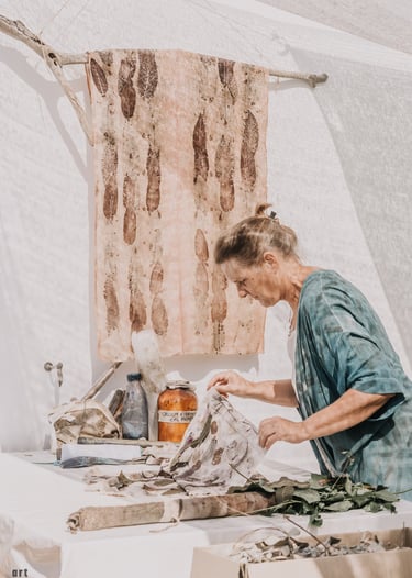Mi amor por trabajar con tintes naturales y ecoprint proviene de la profunda conexión que siento con la naturaleza y la tradición cada vez que creo. El proceso es mágico: me permite transformar materiales simples y naturales en colores vibrantes y patrones únicos, todo ello respetando el medio ambiente. Me encanta descubrir nuevos tonos a partir de las plantas y experimentar con técnicas de ecoprint, que capturan la belleza de las hojas y las flores directamente sobre la tela. Esta fusión de creatividad y sostenibilidad no solo me inspira, sino que también me mantiene arraigada al rico legado del arte textil que comenzó con mi abuela. Es un viaje continuo de aprendizaje y crecimiento, tanto al nivel profesional como personal por el que estoy eternamente agradecida.